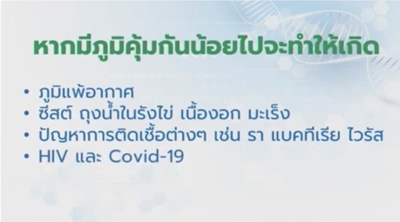 ในทางกลับกัน หากภูมิคุ้มกันน้อยไป จะทำให้เกิดปัญหา ภูมิแพ้อากาศ ซีสต์ ถุงน้ำในรังไข่ เนื้องอก มะเร็ง ปัญหาการติดเชื้อต่าง ๆ เช่น เชื้อรา แบคทีเรีย ไวรัส HIV หรือกระทั่ง Covid-19 เป็นต้น
